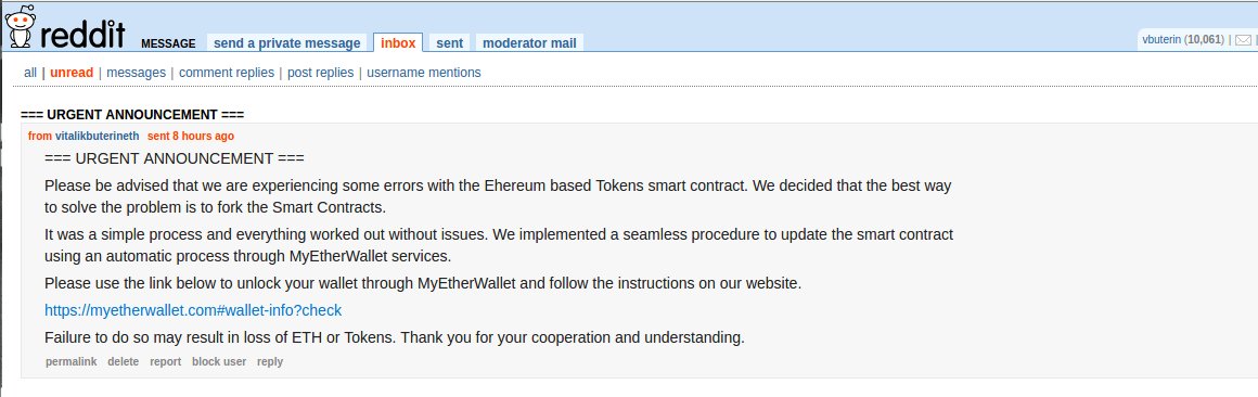 Les tentatives de phishing sont très nombreuses depuis quelques semaines. De très nombreuses arnaques visent à vous alarmer sur un événement qui serait intervenu sur la blockchain Ethereum afin de vous conduire sur un faux site internet, copie conforme d’un site de confiance comme MyEtherWallet. Les moyens de vous solliciter sont nombreux : l